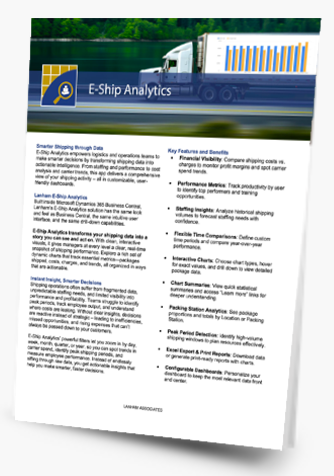 What is Lanham E-Ship Analytics?E-Ship Analytics transforms your shipping data into a story you can see and act on. With clean, interactive visuals, it gives managers at every level a clear, real-time snapshot of shipping performance. Explore a rich set of dynamic charts that track essential metrics—packages shipped, costs, and charges—organized in ways that actually matter. Powerful filters let you zoom in by day, week, month, quarter, or year, so you can spot trends in carrier spend, identify peak shipping periods, and measure employee performance. Instead of endlessly sifting through raw data, you get actionable insights that help you make smarter, faster decisions. Smarter Shipping through DataE-Ship Analytics empowers logistics and operations teams to make smarter decisions by transforming shipping data into actionable intelligence. From staffing and performance to cost analysis and carrier trends, this app delivers a comprehensive view of your shipping activity – all in customizable, user-friendly dashboards. Lanham E-Ship AnalyticsBuilt inside Microsoft Dynamics 365 Business Central, Lanham’s E-Ship Analytics solution has the same look and feel as Dynamics 365 Business Central, the same intuitive user interface, and the same drill-down capabilities. E-Ship Analytics transforms your shipping data into a story you can see and act on. With clean, interactive visuals, it gives managers at every level a clear, real-time snapshot of shipping performance. Explore a rich set of dynamic charts that track essential metrics—packages shipped, costs, charges and trends, all organized in ways that are actionable. Instant Insight, Smarter DecisionsShipping operations often suffer from fragmented data, unpredictable staffing needs, and limited visibility into performance and profitability. Teams struggle to identify peak periods, track employee output, and understand where costs are leaking. Without clear insights, decisions are reactive instead of strategic – leading to inefficiencies, missed opportunities, and rising expenses that can’t always be passed down to your customers. E-Ship Analytics’ powerful filters let you zoom in by day, week, month, quarter, or year, so you can spot trends in carrier spend, identify peak shipping periods, and measure employee performance. Instead of endlessly sifting through raw data, you get actionable insights that help you make smarter, faster decisions. |